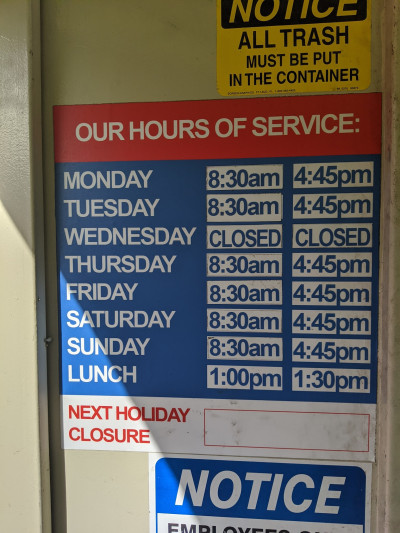 Business Hours state from 8:30 am to 4:30 pm. I arrive at 12:45 pm. A Mexican employee approaches me at the door of my car and talks to me in Spanish. Telling me, I have to return after 1:30 pm. Because he and his co-worker are going to lunch. One man can run the operation. Why can't the two individuals go to lunch at different times to maintain the business open for patrons to recycle their goods. He had poor working skills. I told him, I am not on his time. I am the customer. And, I drove off. This employee apparently works his own schedule.