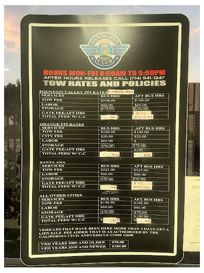 Santa Ana Club in Santa Ana offers the following services: Towing service. You can check with them or contact us—we also offer free vehicle towing, instant quotes, and expert advice on finding the correct parts so you can save money and get exactly what you need with minimal effort.