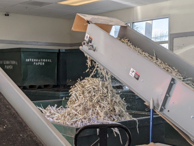 The folks here are friendly and there's something oddly satisfying about sticking around to watch your documents being shred, riding up the conveyor belt and then becoming a mountain of small, uniform pieces of what once were important documents that will now get recycled.