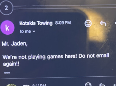 I came home one day and somebody was in my parking spot I called kotakis towing and they were on the job immediately they did their job fast and efficient you can't ask for more better service from people like that