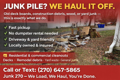 I reached out to the folks at Junk 270 about having some piles of lumber hauled away. I am quite pleased with the entire experience. They showed up to our house when they said they would. They gave me a quote which was very reasonable and were able to do the work right then. I would definitely use them again and would recommend Junk 270 to anyone needing this type service. Thanks so much to the fine people at Junk 270 and prayers for his brother A.D.