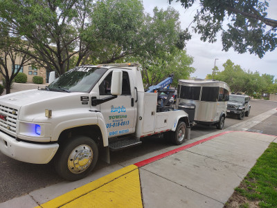 My granddaughter had a blowout on her car and she didn’t have the spare. She had pulled over on the shoulder of the very busy Interstate 25 corridor near Bernalillo. It was frankly dangerous with trucks blowing by at 75+ mph. I decided to have the car towed to the nearest tire shop. The first tow company I called recommended Angels for that area. They picked up the phone quickly. Fortunately they were available right away to meet me at the car. They were professional and quick with their business to get it on the trailer and to the shop. The price was reasonable. I recommend them based on my experience: