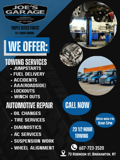 My car had a sudden failure on the highway about 10 miles out of Binghamton. I called Joe's and they arrived 20 minutes later to tow my car back to town. I opted to hire them to make the engine repair. It only took a few days to schedule me in and get the part installed. I was pleasantly surprised how affordable the tow and engine repair was. I highly recommend them.