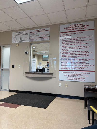 Employee, heavy set wearing red shirt , not being mean just don’t know her name, was using her personal cell phone when I came in and mumbled something to me through glass and didn’t even get up to tell me and remove glass partition until I asked why I had to sign in. Then while removing items from the car she called the guy staring at me while I worked after 3 or 4 min that we had to go back up to the front but never told me I had only 10 min and it had only been 3 or 4 min anyway. It was all just so bad and I was so upset I decided to let the car stay after I got my money and things of my sons out of the vehicle. Just total rude and disrespectful employees but since Irving police, I expect nothing less. Trashy but the guy who took me to my car was nicer to me and friendly.